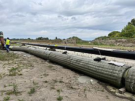 Incomat Pipeline Cover (IPC) can be used wherever the protection of a pipeline against mechanical impacts or buoyancy protection is required. In contrast to producing the concrete casing using conventional formwork technology, the IPC system is quick and efficient. The prefabrication of the geotextile formwork at the factory eliminates the need for time-consuming formwork work on site. Furthermore, the fast assembly of the custom-made elements and the optimized concreting process enable rapid construction progress. Pipe curvatures or different pipe diameters can be easily encased with the appropriate pre-planning and assembly.